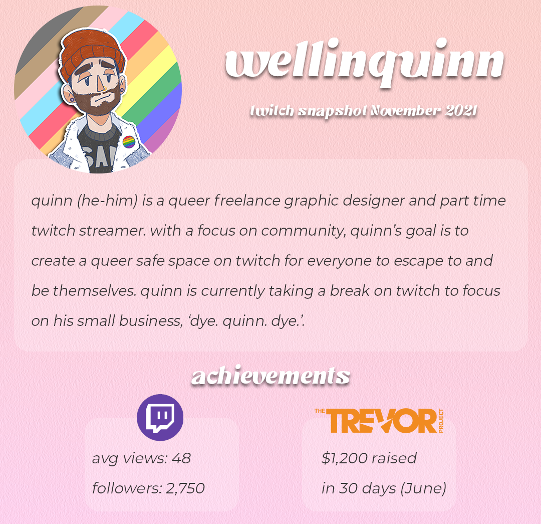 i conceptualised, designed and created all assets related to my twitch channel (excluding emotes). layouts, alerts, press kits and commissions.